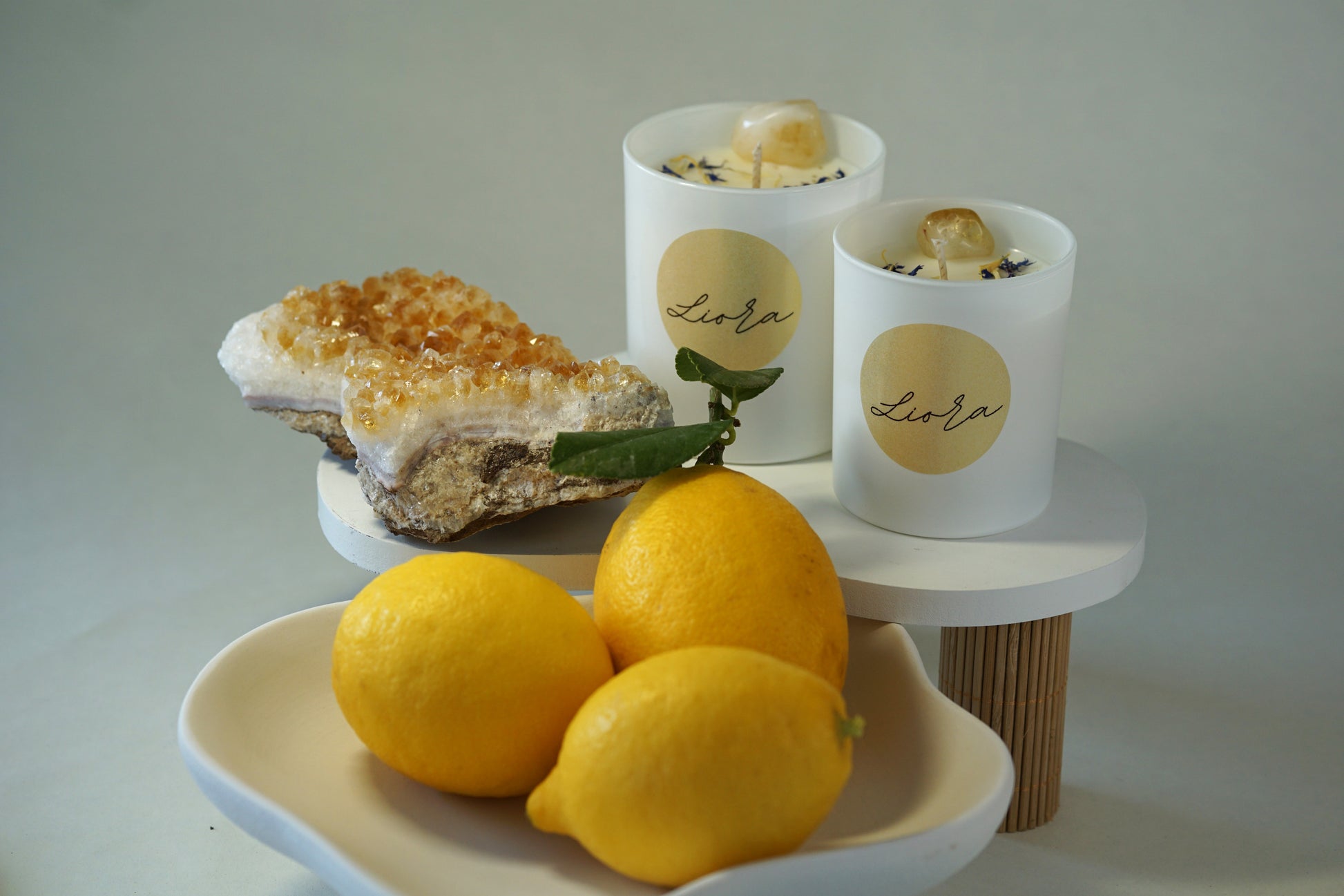 Mineralkerze aus 100% Sojawachs mit Citrin Mineral und ätherischen Ölen – 30 cl.