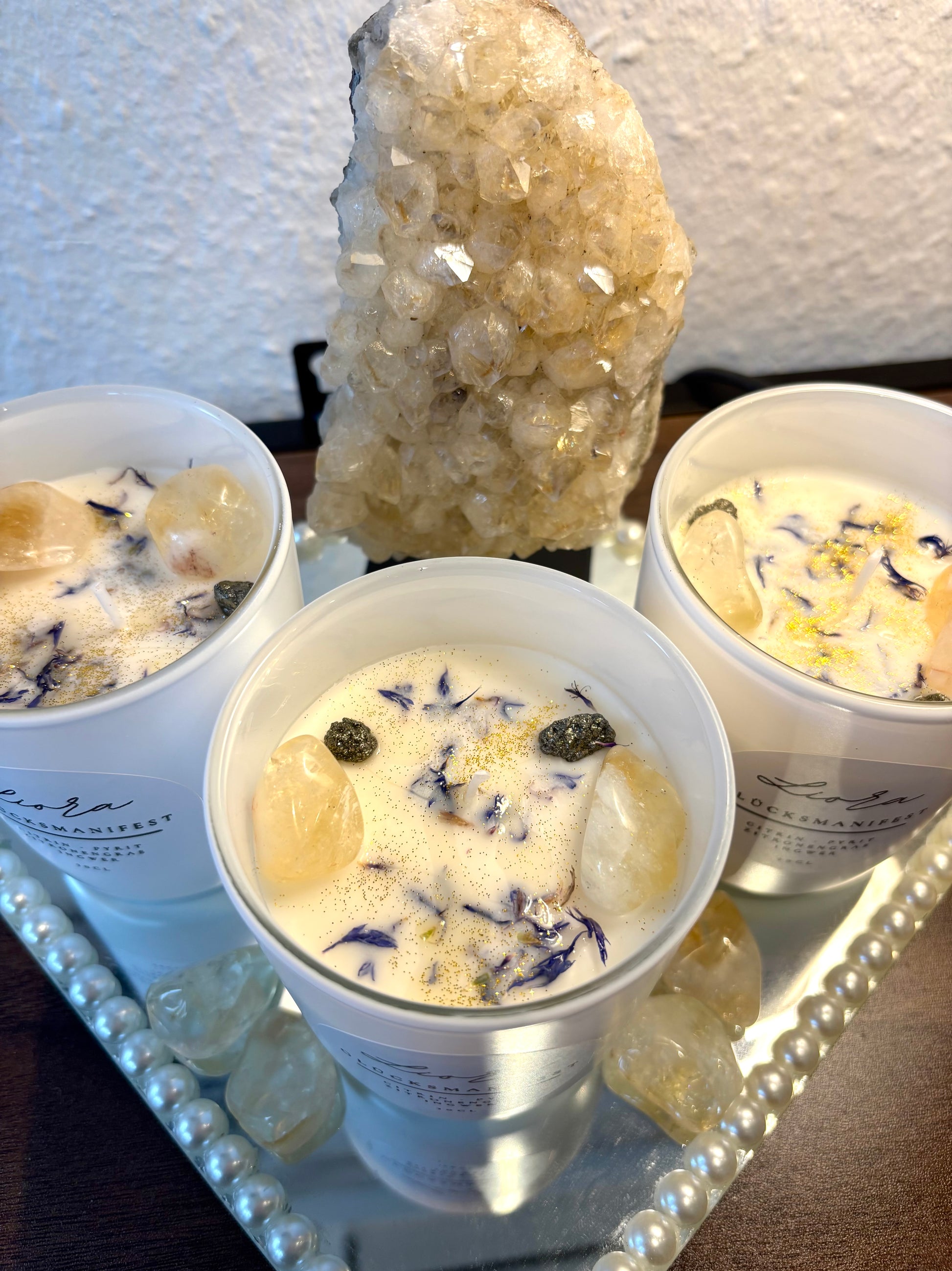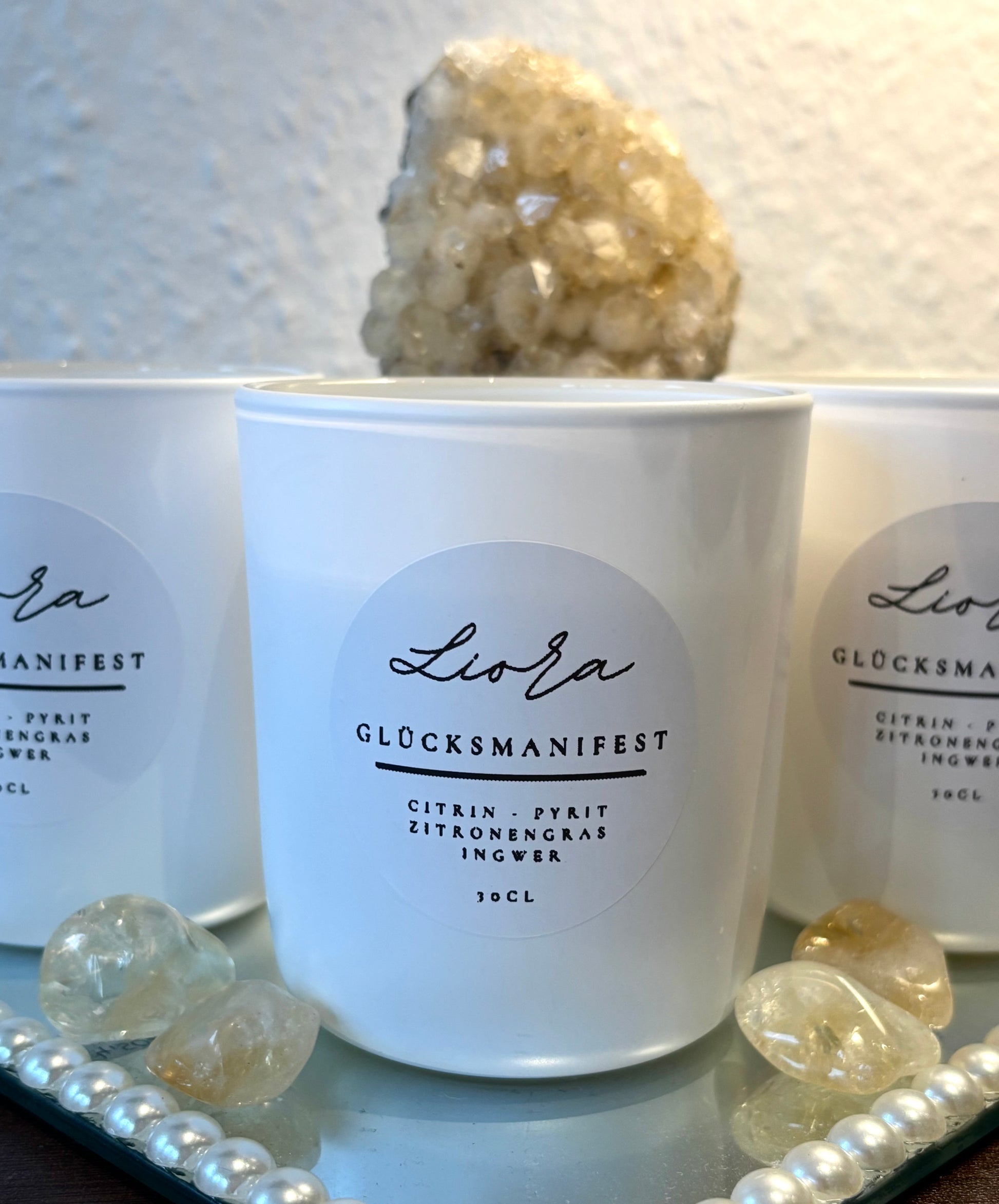 Diese handgefertigte Kerze aus reinem Sojawachs ist mit dem kraftvollen Citrin & Pyrit und hochwertigen ätherischen Ölen veredelt.