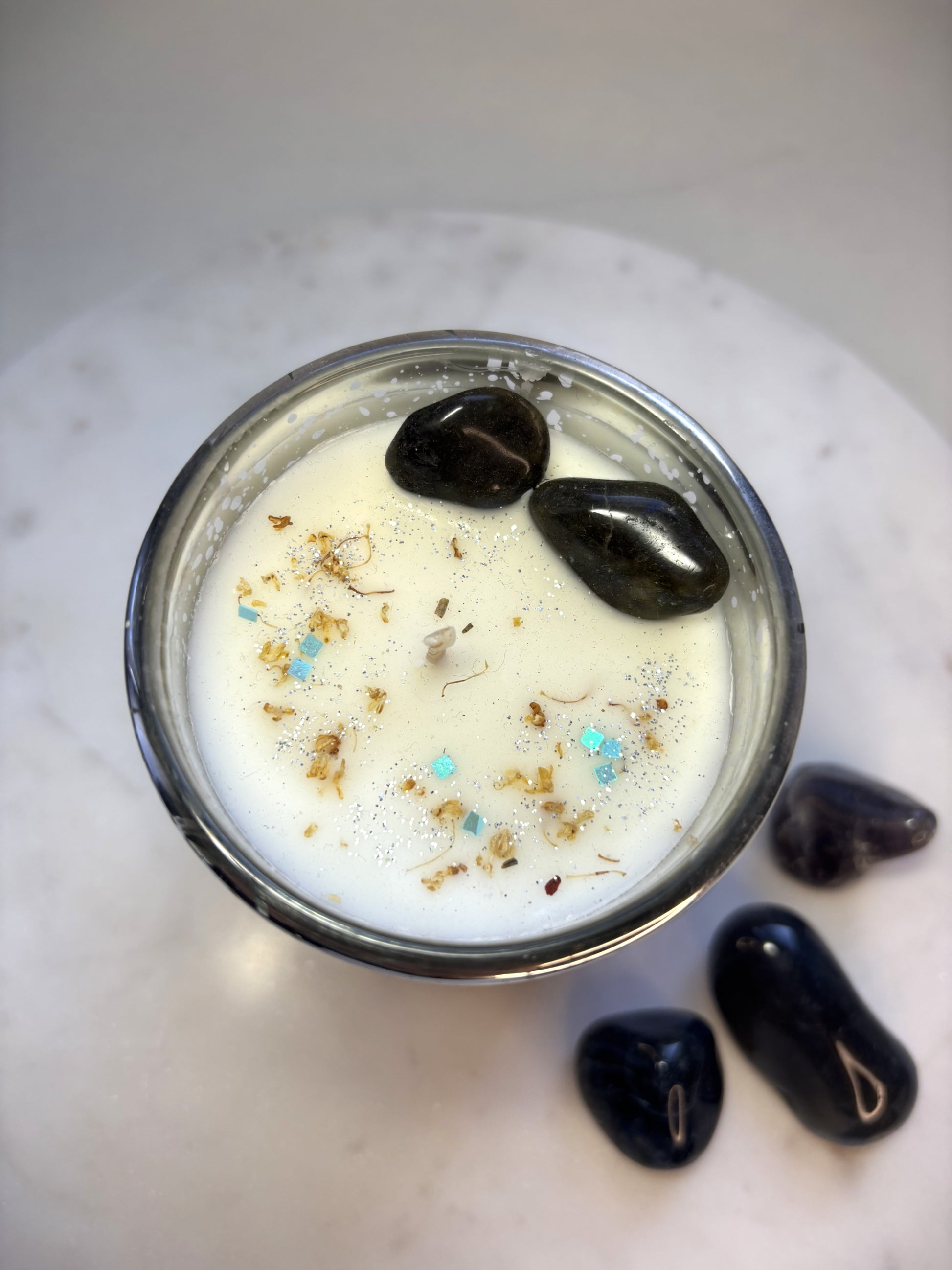Mineralkerze aus 100% Sojawachs mit Labradorit Mineral und ätherischen Ölen