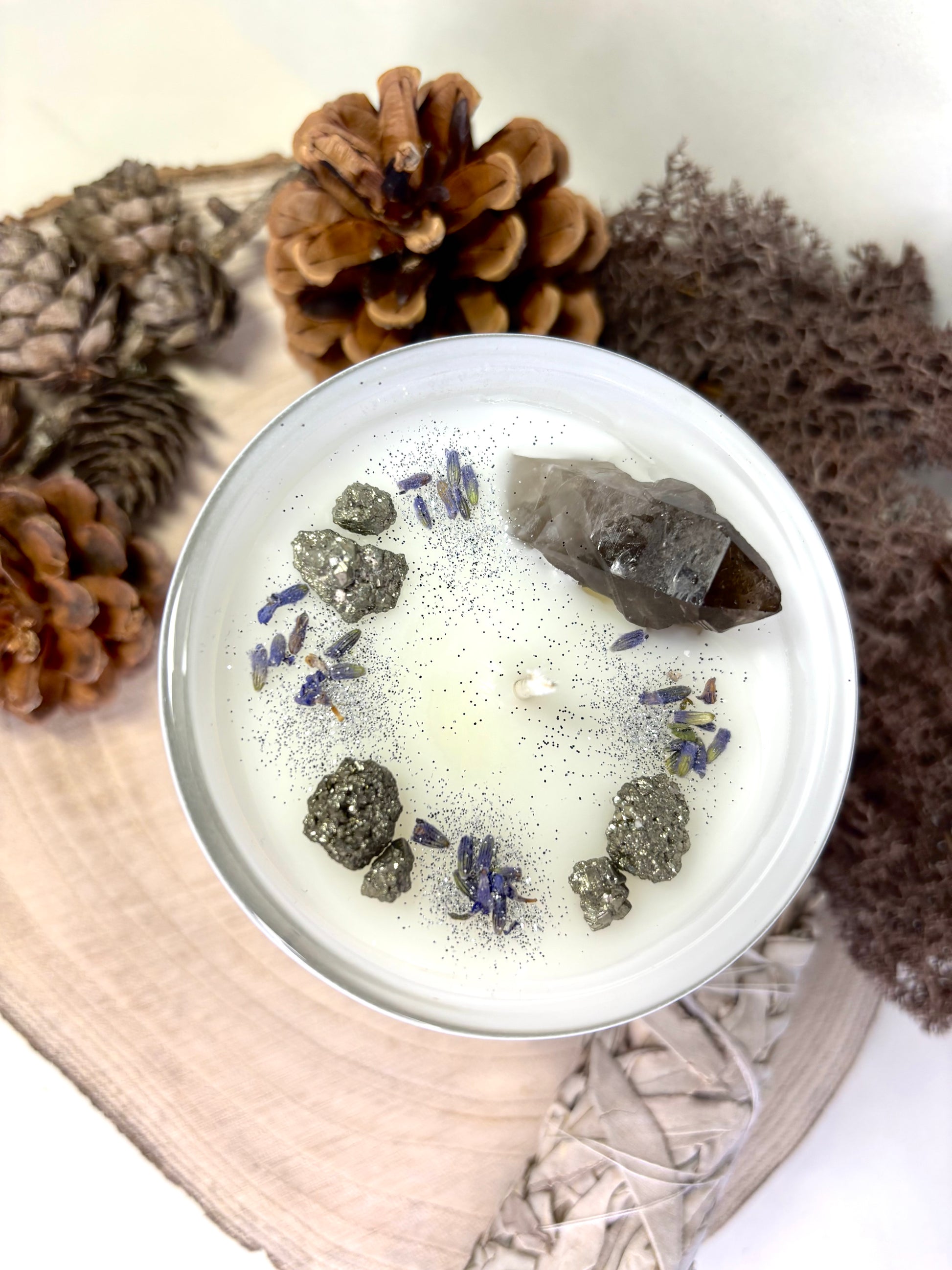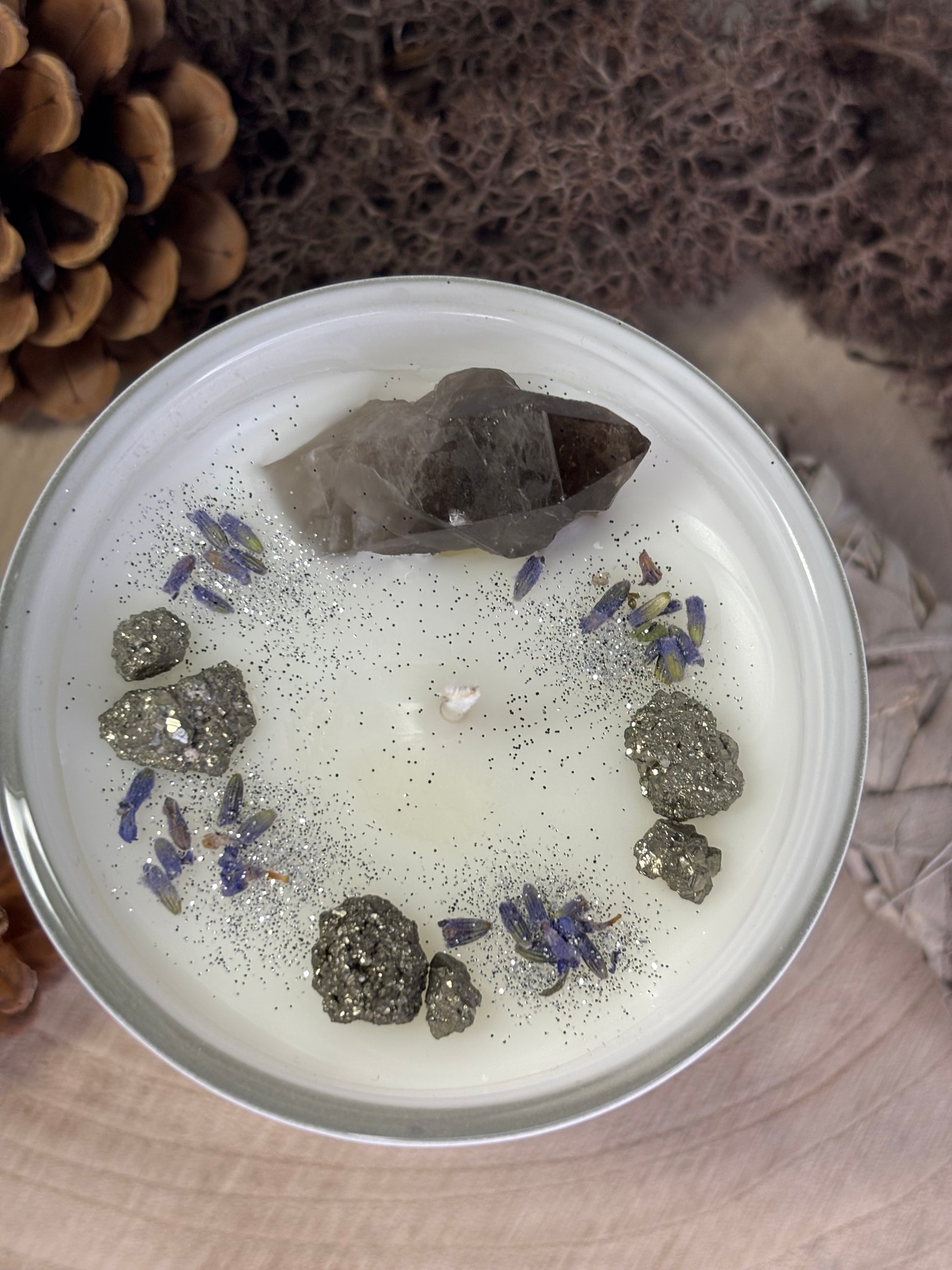 Mineralkerze aus 100% Sojawachs mit Rauchquarz & Pyrit Mineral und ätherischen Ölen