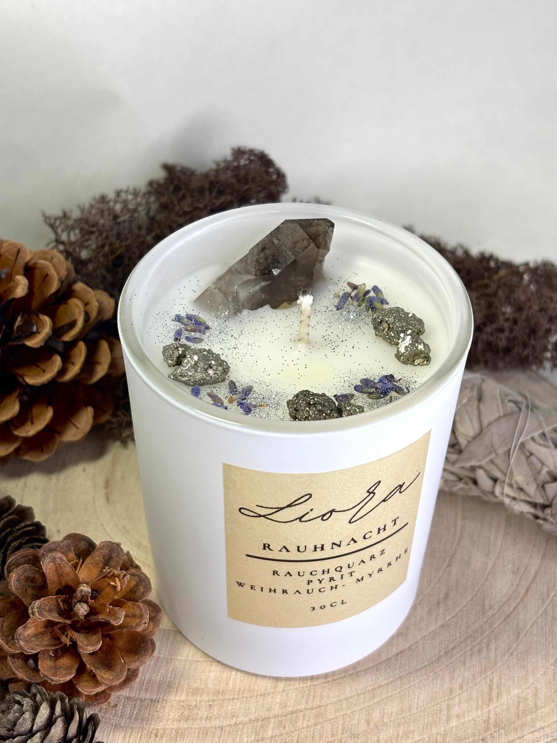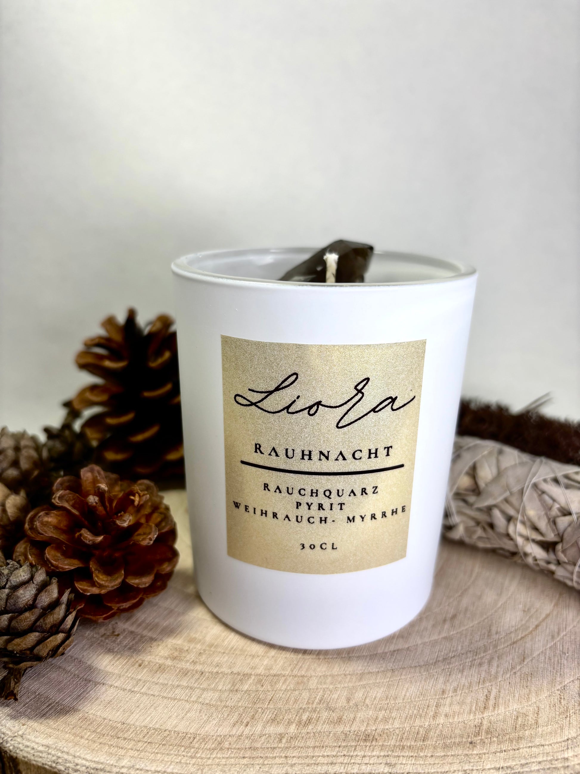 Diese besondere Raunachtskerze vereint die erdende Energie des Rauchquarzes mit der klaren, kraftvollen Ausrichtung des Pyrits. Rauchquarz unterstützt das Loslassen alter Energien und bringt Ruhe in die magische Zeit der Raunächte, während Pyrit Schutz, Fokus und Manifestationskraft stärkt. Gemeinsam schaffen sie ein harmonisches Feld aus Reinigung, Klarheit und Neubeginn, ideal für Rituale, Intentionen und die energetische Begleitung durch alle zwölf Raunächte.